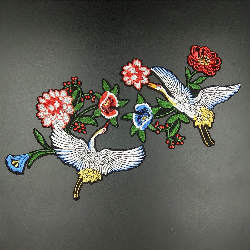 Cheapest 2pcs/lot Crane&Flower Patch Embroidery iron on patch Decoration Accessories Embroidered patch for clothing For DIY
