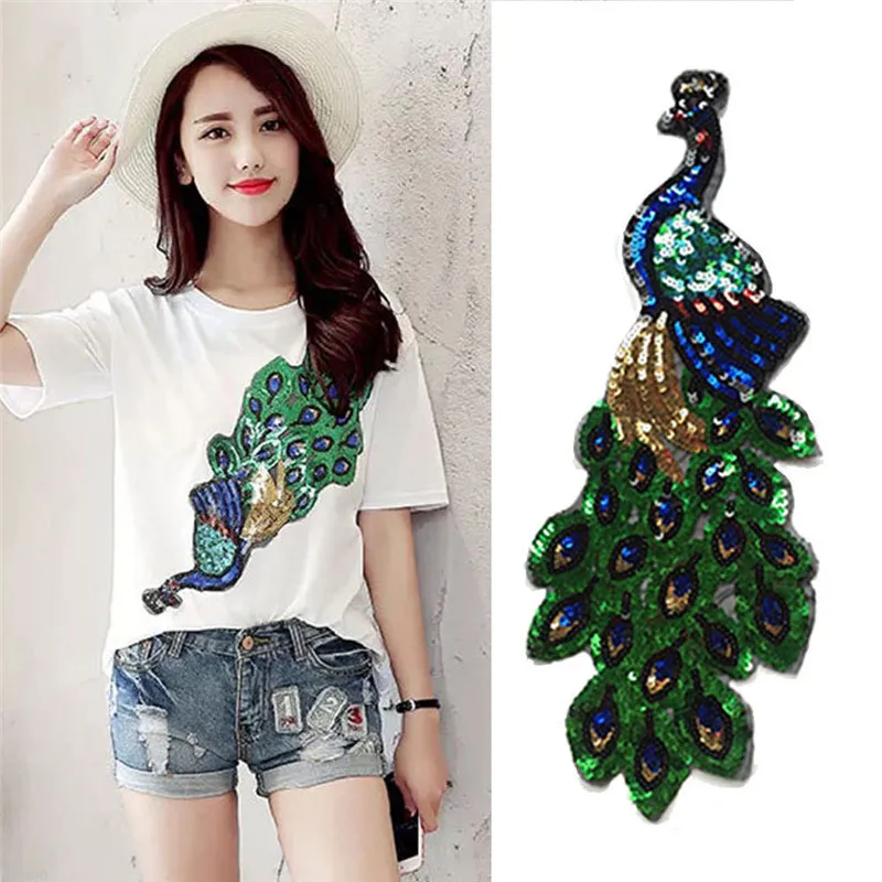 Discount !! 1pcs Colorful Sequin Peacock Embroidery Fabric Large Applique Patch African Lace Iron On Dress Cloth Decorate Accessory Diy